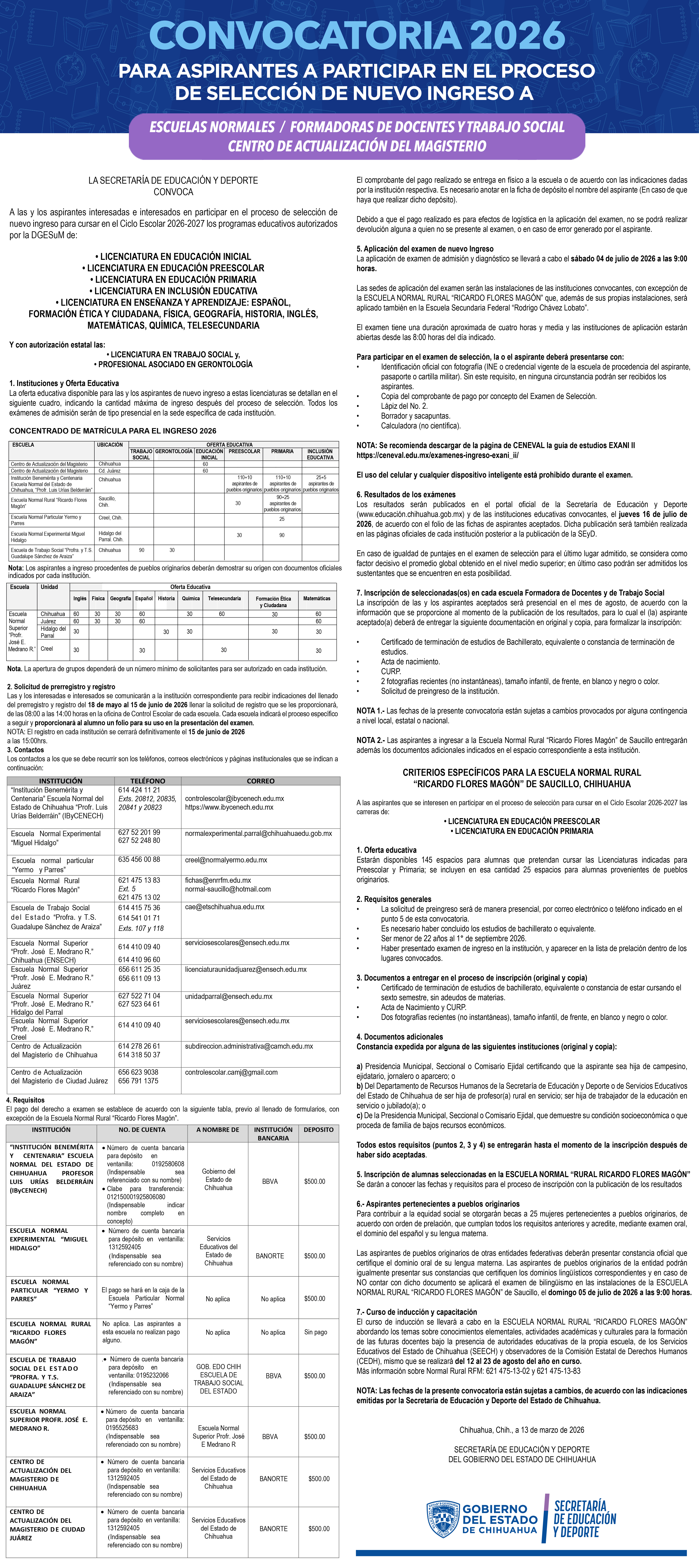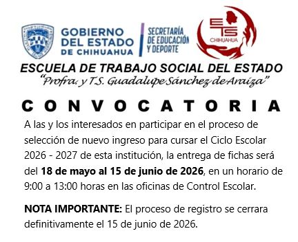 Convocatoria para aspirantes a nuevo ingreso del Ciclo Escolar 2026 - 2027 a la Escuela de Trabajo Social del Estado de Chihuahua "Profra. y T.S. Guadalupe Sánchez de Araiza"